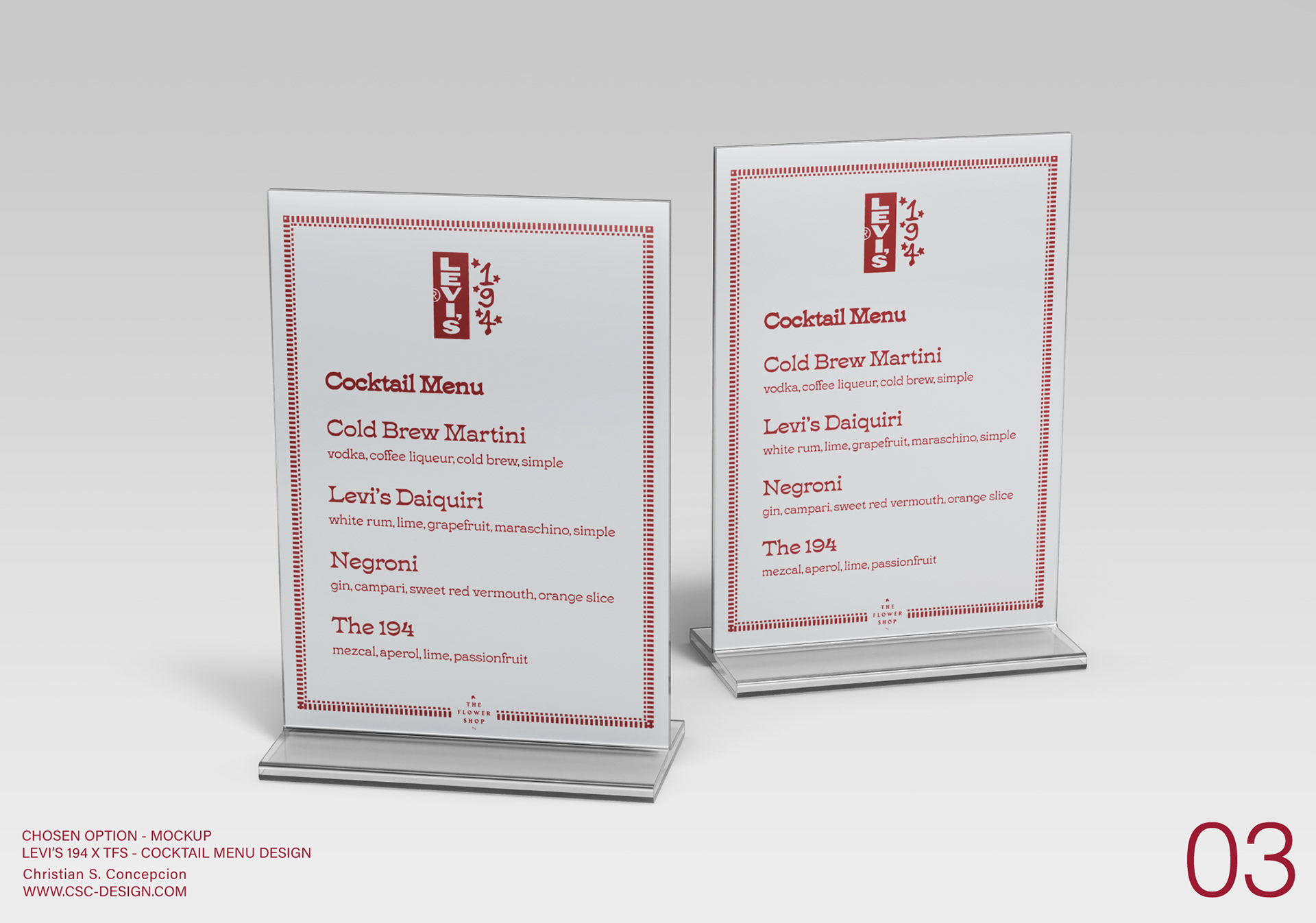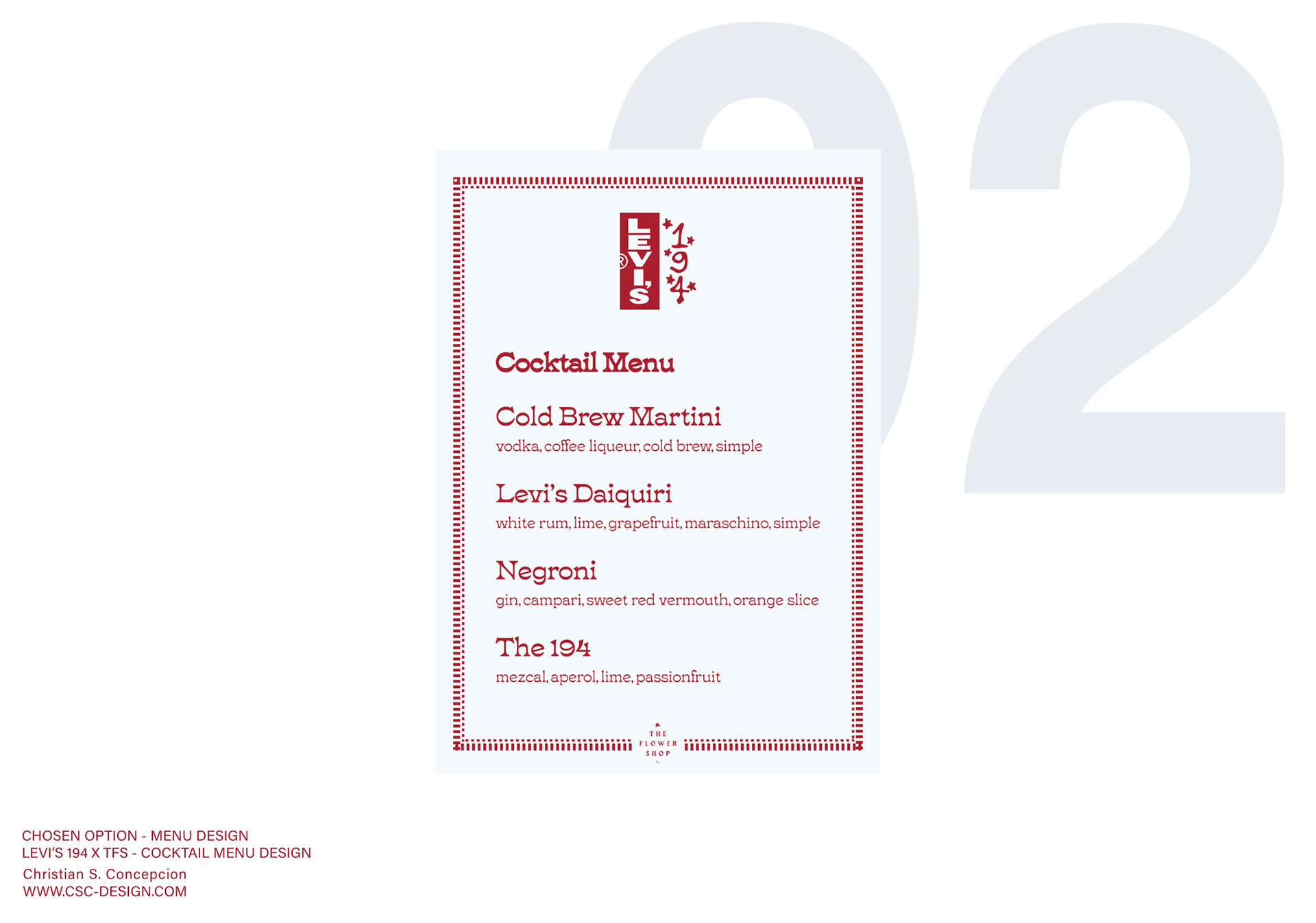 During my current in-house graphic design role at The Flower Shop, I designed a custom-branded cocktail menu for a Levi’s 194 x The Flower Shop event. The design merged Levi’s archival Americana aesthetic with TFS’s warm, nightlife-driven personality, creating a premium, collectible menu piece that anchored the event’s visual identity. I led concept development, visual direction, typography, layout, and print‑ready production. The final menu design served as a key touchpoint for guests, elevating the experience through thoughtful brand integration and a polished, cohesive presentation.